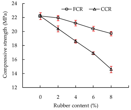 - The addition of rubber has a negative impact on the compressive strength of pervious concrete. Compressive strength decreases with the increase of rubber incorporation level. Although the addition of rubber reduces the compressive strength of the pervious concrete, it can still meet the requirements of non-structural use. Fine crumb rubber is more advantageous than coarse crumb rubber in modifying pervious concrete without sacrificing excessively compressive strength.