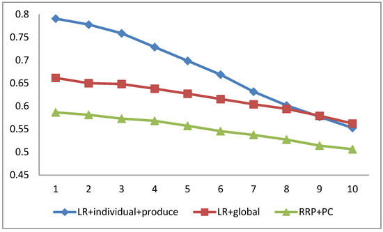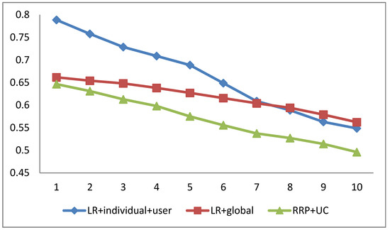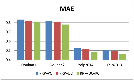 From Figure 3, we can find the MAE of RRP + UC + PC is greatly improved when the user context information is removed compared to the removal of the product context. For example, when the user context information is removed, the MAE of RRP + UC + PC is increased by 4.49% ((0.8170 − 0.7803)/0.8170) in the douban2 datasets. However, when the product context information is removed, the MAE of RRP + UC + PC is only increased by 3.44% ((0.8081 − 0.7803)/0.8081) in the douban2 datasets.