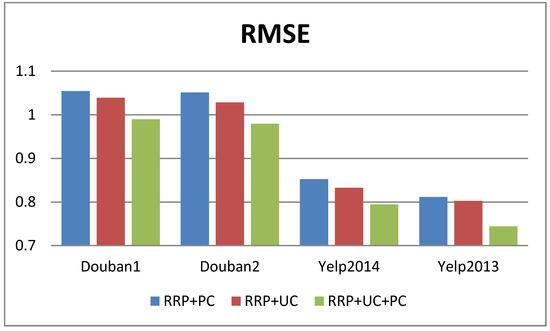 From Figure 4, we can get the same result. We find the RMSE of RRP + UC + PC is greatly improved when the user context information is removed as compared to the removal of the product context. For example, when the user context information is removed, the MAE of RRP + UC + PC is increased by 8.29% ((0.8114 − 0.7441)/0.8114) in the yelp 2013 datasets. However, when the product context information is removed, the MAE of RRP + UC + PC is only increased by 7.27% ((0.8024 − 0.7441)/0.8024) in yelp2013 datasets.