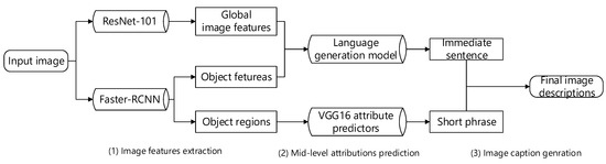 In this section, we introduce the contributions of this paper, including global and local image feature extraction, the prediction of the middle-level attributes of objects, the language generation model, and language retouching of the intermediate image caption. The framework of our proposed method can be seen in