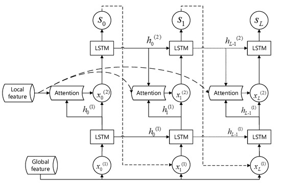 23], the “hard” and “soft” attention methods were respectively applied to two different image captioning frameworks. “Hard” attention is not dependent on all hidden states of the language model, and the gradient in “hard” attention needs to be estimated by Monte Carlo-based sampling. On the other hand, “soft” attention is used to calculate the weights of all input feature vectors and to generate an encoded feature vector. Therefore, “soft” attention is a parameterized method, and it can be embedded in the language model for training directly. Most existing methods use “soft” attention as the basic attention mechanism.