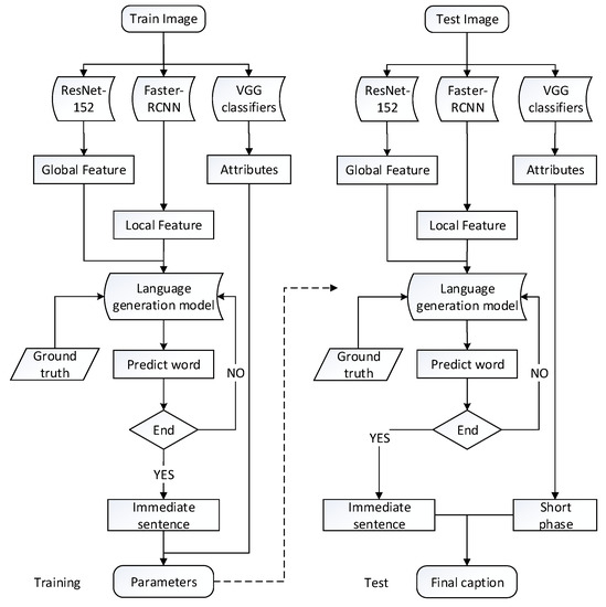 Figure 3). In the training part, we aimed to obtain the model parameters by training our language generation model and middle-level attribute predictors. In the test part, we separately used the language generation model and the ensemble attribute predictor to generate the intermediate image caption and the middle-level attribute labels. Then, the attribute labels were used to retouch the intermediate image caption to generate a final well-described sentence.