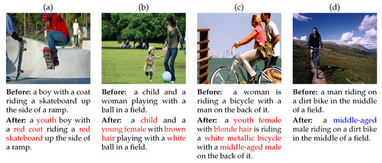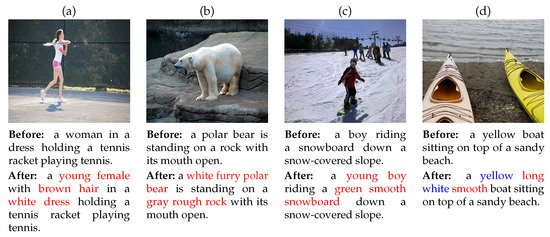 Figure 6a–c, we can observe that the final image captions generated by our method accurately depict the details of the objects when using the middle-level attributes to retouch the intermediate image caption, including the age and gender of humans, and color and texture of non-human objects. Meanwhile, from