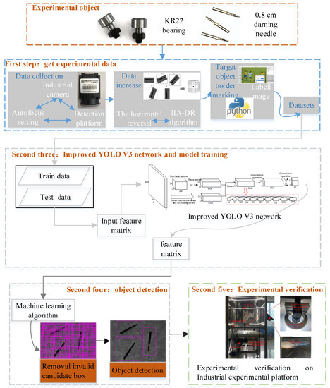 Deep convolutional neural networks (CNNs) [7,8] have recently shown remarkable advantages in object detection, which is realized with two main methods. The first method is based on region generation. In this method, a number of candidate regions that may contain objects are initially generated, and each candidate region is classified with a CNN [9,10,11]. The second method is a regression-based method that uses CNNs to process entire images and predict object classification to achieve object localization [12,13]. This method is generally faster than the pre-classification method. To compensate for the accuracy limitation of the post-type detection method, Li et al. [14] and Sang et al. [15] increased the structure of a deep CNN to improve network accuracy. However, a deep CNN frequently leads to high computational complexity, and the information tends to gradually disappear after multilayer transmission. Densely connected convolutional networks [16] allow each layer of a network to accept the feature maps of all layers before it, and perform data aggregation in a concatenate manner. These processes enhance feature propagation, effectively solve gradient disappearance, realize feature reuse, and improve network classification accuracy. CNNs have been widely investigated in many applications. Considering the imbalance distribution of machinery health and the uncertainty of neural network learning characteristics, Jia et al. [17] proposed a deep normalized CNN to aid the understanding of what CNNs learn in fault diagnosis for machinery. Guo et al. [18] combined eight classical time–frequency features and six related-similarity features to obtain original features. Then, they used the training features of a recurrent neural network to accurately predict bearings’ remaining useful life. To solve many scientific problems in mining science, Tadeusiewicz [19] et al. indicated that neural networks can be valuable, and presented several studies on the usage of neural networks in the mining industry. Ganovska [20] et al. developed 150 different configurations of neurons in hidden layers, and combined the Bayesian regularization and Levenberg-Marquardt algorithm to predict the surface roughness of mechanical products. Zhang [21] et al. used the vibration signals of a deep groove ball bearing, extracted the relevant features, and utilized a neural network to model the degradation for identifying and classifying fault types. These studies focused on algorithmic improvements in CNNs and innovations in different application scenarios, whereas few studies reported on high-precision parts used in small quantities, especially in the aerospace industry. Meanwhile, many difficulties, such as high complexity, low recognition efficiency, and insufficient robustness, still exist in the detection of special mechanical parts with complex illumination and background. Therefore, we use a You Only Look Once (YOLO) V3 algorithm [22] based on the fast detection speed of a regression method to simplify the original YOLO V3 network, fuse the data increase [23] and multiscale training [24] strategies, and train the improved YOLO V3 algorithm to improve the speed, accuracy, and stability of 0.8 cm darning needles and KR22 bearings in industrial scenarios. The detection effect of this method is remarkably improved on a built real-time industrial platform. Figure 1 shows the technical flowchart of this study.
