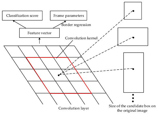 Candidate boxes represent the location of possible objects in an image. They can be extracted by using a region proposal network (RPN). The core concept is to use a CNN to directly generate candidate boxes, share the convolution features of the image with the entire detection network, and reduce the extraction time of the candidate box area. The RPN network extracts candidate regions by using a sliding window in the final convolutional layer, and generates multiscale candidate frames on the basis of the regression mechanism of the given initial specifications and positioning frames. Notably, the input image in the YOLO V3 detection method is divided into cells. Each cell is given B different specifications of the initial candidate box, and these candidate boxes serve as the initial position of the possibly existing object. Figure 2 shows that the predicted candidate frame is extracted through the volume layer network, and that the number of candidate frames per image is .