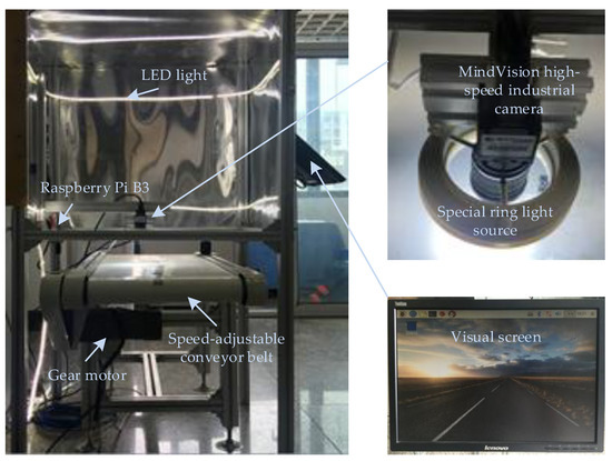 Figure 6 shows the structural diagram of the experimental detection platform designed in this study. The platform included a conveyor belt, data processor, data acquisition sensor, light source, and other mechanical supports. The device used to input and display data was a 32-inch industrial touchscreen. The visual-sensing device used a MindVision high-speed industrial camera (http://www.mindvision.com.cn/cpzx/info_7.aspx?itemid=1758&lcid=21) with an electronic rolling shutter, which can collect high-speed motion samples in real time. The data processor was a Raspberry PI B3 (https://www.raspberrypi.org/products/raspberry-pi-3-model-b/). An adjustable ambient light-emitting diode light strip (https://store.waveformlighting.com/products/real-uv-led-strip-lights-16-ft-5-m-reel) was installed to ensure sufficient light in the system box. A special ring light source for the alarm was installed outside the industrial camera to fill the light on the test sample and obtain a clear sample image. For data analysis, the workstation used to reduce the computing load of the data processor was configured with Intel Xeon CPU E5-1620 V3 3.5 GHz, 16 G memory, NVIDIA GeForce GTX1080, and Ubuntu 16.04. Meanwhile, the computer processor of the detection device and the workstation were installed with OpenCV 3.1, TensorFlow 1.3, and YOLO V3. The Raspberry PI B3 contains a wireless communication module that can realize end-to-end communication between the experimental detection platform and the workstation. Specifically, traditional visual calibration methods cannot easily obtain high-definition experimental images for small mechanical parts. Thus, we used manual experience to calibrate our visual inspection platform.
