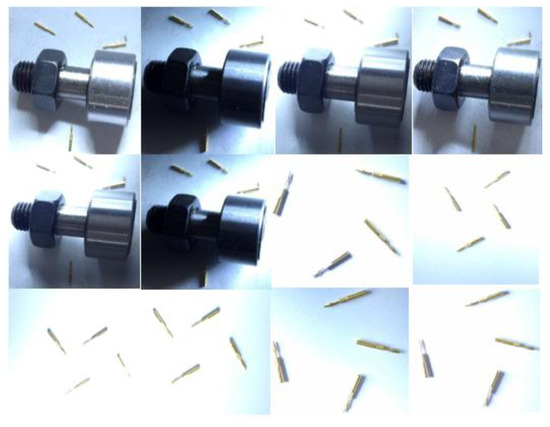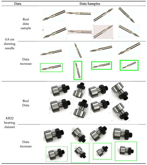 KR22 bearings and 0.8 cm darning needles with different backgrounds and postures were selected to increase the image data. The sample image quality and the number of increased samples are improved by horizontal mirroring of the training samples and angular rotation from [0°, 22.5°, 45°, 67.5°, 90°], and by intercepting the central location of object detection in the increased image. Figure 8 shows an example of an image after partial data increase. The label is discarded when the object near the edge of the image is missing or completely lost. The same amplification data and corresponding tags as input data objects are generated when data is supplied to the data increase algorithm.
