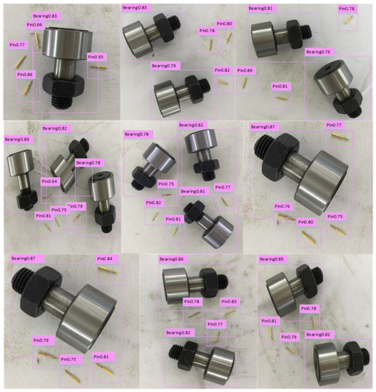 The detection method can realize multi-object detection in one image, and the detection results are expressed as follows. For the preceding experimental verification, the YOLO network-based object detection method for precision parts and the deep network model constructed by the data can be used to detect the position of precision parts and to identify them. The accuracy can reach 100%, and the detection speed can reach 290 fps, both of which satisfy real-time requirements.