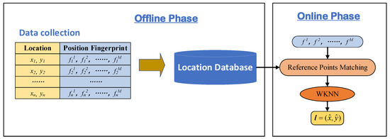 In the online phase, the feature vector of the observed target signal is matched with each sample of the positioning database. A specific number of samples are selected as the adjacent RPs according to the similarity with the target. Finally, the position of the target can be calculated by the specific position estimation algorithm based on the adjacent RPs according to the matching result. Exactly the same estimation algorithm used in the RADAR system, weighted-nearest neighbor (WKNN) [36] is usually used for the fingerprinting localization process.