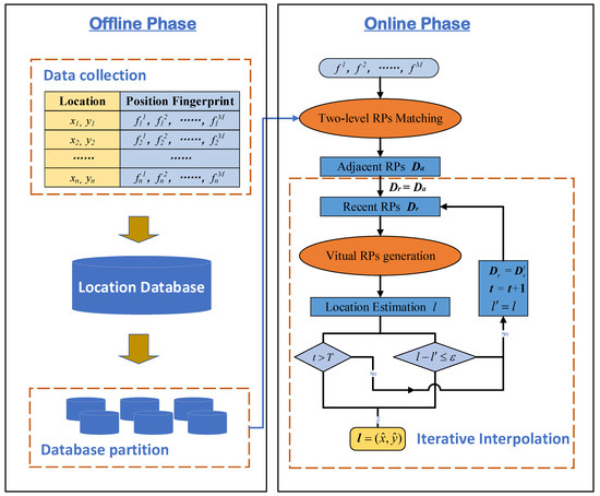 The rest of the paper is organized as follows: In Section 2, the general process of the fingerprinting acoustic localization is briefly introduced. In Section 3, the positioning database partition by cluster analysis and the adjacent RPs searching based on the two-stage matching method are stated, and then the iterative interpolation method is proposed to generate the virtual RPs for ensuring the target position estimation accuracy with few initial RPs. Section 4 presents the implementation details and evaluates the performance of the novel methods from the results obtained. Finally, some conclusions are drawn in Section 5.