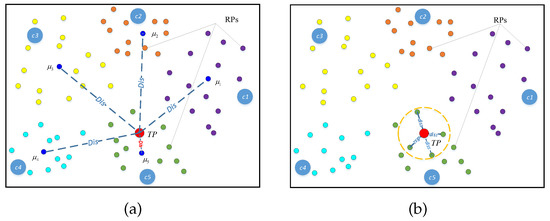 Two-stage RPs matching process: (a) the adjacent cluster matching process; and (b) the adjacent RPs matching process. The purple, orange, yellow, blue and green dots are the RPs clustered to different clusters marked as c1 to c5; the dark blue dots are the cluster centers marked as to ; the red dot denotes the TP; means the Euclidean distance between TP and each cluster center; and means the Euclidean distance between TP and each RP in adjacent cluster.