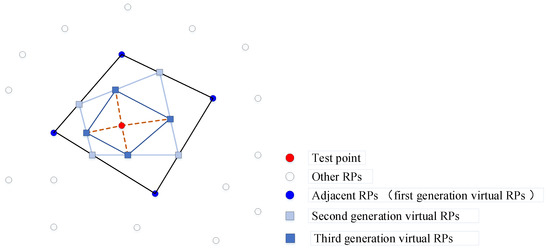 In the online positioning process, the virtual RPs can be generated by the iterative interpolation method, as Figure 4 shows, where the iteration interpolation process is based on four adjacent RPs. In the interpolation process, the first generation virtual RPs are defined as the adjacent RPs selected before as . During the iteration interpolation process, the elements of are refreshed by: