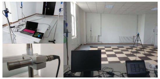 To demonstrate the performance of the proposed acoustic localization approach based on the cluster analysis and iterative interpolation, real-world experiments have been carried out in a practical room. The room is w 9.64 × 7.04 × 2.95 m, where the noise is about 40 dB and the walls are not insulated. The scene and equipment of the experiments are shown in Figure 5. The target area is a rectangular plane with the length of about 6 m and width of about 5 m. The four-channel microphone array is composed of the MPA201 microphones produced by the BSWA Technology Co., Ltd., Beijing, China. The microphones are installed at the four vertices of the positioning area with the height about 1.35 m above the floor. The type of the acquisition card is known as NI9215A from NI company, Austin, USA. The sampling frequency is set as 100 kHz, and the sampling period is 1 s. The sound source is a Bluetooth speaker with the same height as microphone array. A system-provided text tone called “Popcom” in iPhone 6 is selected for localization sound signal.