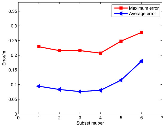 As shown in Figure 6, when division number increased from 2 to 4, positioning accuracy slightly improved compared with global linear matching. That is mainly because, according to the clustering results, the outlier points with large measurement errors in the sub-database can be eliminated by outlier test method. However, when the number of sub-databases increased to 5, the localization result began to deteriorate significantly. Moreover, when the division number increased to 6, the average error exceeded 0.18 m, while the maximum error reached 0.2780 m and 61.5% of the test point positioning accuracy could not meet the 0.20 m positioning requirements.