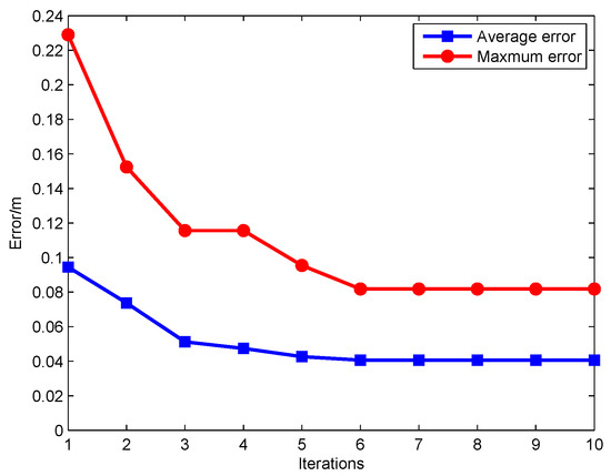 The global positioning results by examining the average error and maximum error of the positioning results of 13 test points has been evaluated. As shown in Figure 7, the iterative interpolation method can reduce the average error from 0.0945 m to 0.0406 m, and the maximum error from 0.2290 m to 0.0818 m. In the process of iterative interpolation, the effect of location accuracy improvement is obvious in the first six iterations. However, along with the iterative process and the improvement of positioning accuracy, the effect is gradually weakened. The same phenomenon also occurred at the maximum error.