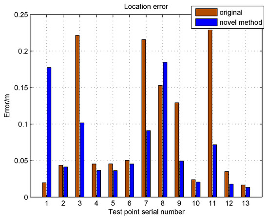 To analyze the influence at different test points, the position accuracy comparison of the novel method and the original method were taken on each test point. As Figure 9 shows, the novel method brought significant improvement of positioning accuracy for 11 of the 13 test points. In the novel method, the errors of Test Points 3, 7, 9, 11 and 12 decreased more than 50% from the original location method. However, Test Points 2, 4, 5, 6, 10 and 13 were not sensitive to interpolation process because they already had relatively high positioning accuracy. It must to be pointed out that the location results of Test Points 1 and 8 got worse and result in no apparent improvement in maximum error. That is because these points were located at the boundary of two sub-databases, and their adjacent RPs were assigned to different clusters by feature clustering partition method. The causes of location error are complex and varied; to further decrease the location error, improvements of other links in fingerprinting acoustic localization process are also needed.