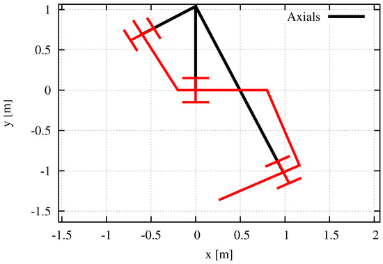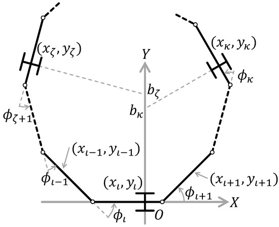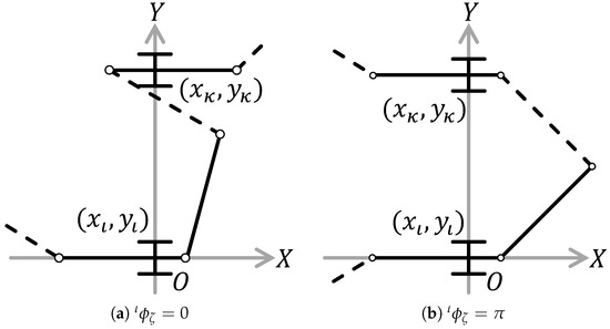 An equation in the parentheses equals x coordinate of the passive wheel of next non side-slipping link (th link) of when . Hence, the axials of the passive wheel of both current and next non side-slipping link overlap. □