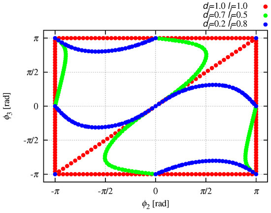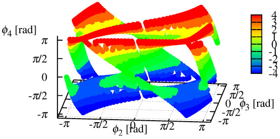 Figure 8 and Figure 9 show the relative angles on the singular configuration in the state coordinate space. Red shows singular configuration with m and m (Case 1 in Table 3). This configuration has been defined as singular configuration in the previous studies. In fact, red shows state values of either straight line or arc shape. If the singular configuration is either straight line or arc shape—i.e., it depends on the state values only, the relative angles in the state coordinate space are unchanged even if the designable parameters are changed. However, green and blue in both Figure 8 and Figure 9 are absolutely discord. That is, Figure 8 and Figure 9 clearly show that the singular configuration of the snake-like robot depends on the designable parameters as well as the state values. Figure 10 and Figure 11 show the relative angles on the singular configuration including side-slipping in the state coordinate space, and these are absolutely discord. Hence, Figure 10 and Figure 11 also clearly show that the singular configuration of the snake-like robot depends on the designable parameters as well as the state values. Thus, the designable parameters affect dynamics of the snake-like robot.