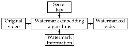 Watermark embedding is the process which embeds binary strings representing author’s information or copyright information into the original video through a specific embedding algorithm. The embedding algorithm must take the balance between invisibility and robustness of the watermark into account. The model of embedding process is shown in Figure 5.