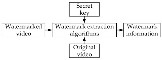 Watermark extraction is the inverse process of watermark embedding. The position of watermark embedding is determined first, and then the watermark is extracted from the video data combining the secret key with the watermark extraction algorithm. Finally, the extracted watermark is decoded to obtain the original watermark information. The basic model of watermark extraction is shown in Figure 6.