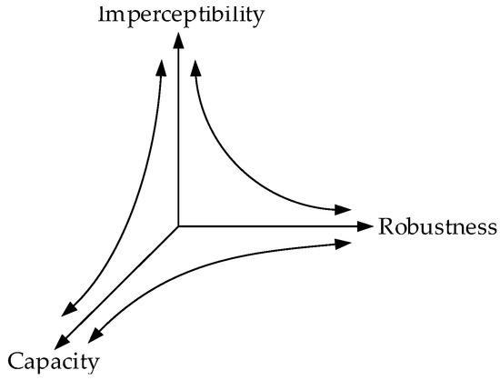 Watermark capacity refers to the number of watermark bits embedded in unit time or a single video. The watermark capacity, imperceptibility, and robustness are mutually restricted [22], and their relationship is shown in Figure 7.