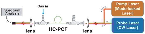 The parameter was estimated using Equation (6) for reasonable ranges of those parameters to achieve MOM with molecular hydrogen. The modulation was based on the rotational transition of -hydrogen (, ), that produced a modulation frequency, , of 17.6 THz. This was used previously [9,10] for MOM of a cw laser in a high-finesse optical cavity filled with hydrogen. The 852-nm probe beam was a commercially available laser diode. The pump beam was an ultrashort 30-fs optical pulse that was less than one 57-fs rotational period of the hydrogen molecule, and had a ∼25-nm full-width at half-maximum spectral bandwidth. Thus, it created coherent molecular motion efficiently [22]. The 852-nm center wavelength of the pump beam was the same wavelength as that of the probe beam. However, The transverse modes of both the pump and probe beams had the lowest mode of a Gaussian shape, with beam diameters of 10 m at intensity, which was similar to the core diameters of typical HC-PCFs. The specific parameter of a hydrogen molecule that determines its Raman polarizability, , was assumed to be 2.6 × 10, which was estimated from an experimental rotational Raman gain coefficient [23].