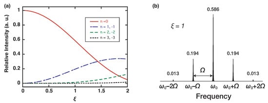 where , and is an n-th order Bessel function. Here, is an initial spectrum that is an extremely narrow line at for a cw laser beam. Equation (5) reveals a comb-like spectrum with equally-spaced lines separated by that is symmetrical about the initial probe frequency. The intensities of the 0-th order component and the n-th order sidebands are determined by the n-th order Bessel function, . The parameter is derived from Equations (2) and (4):
