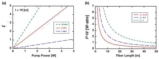 Figure 3a shows the dependence of on the power of the pump pulse P (W) in the core of a 10-m-long HC-PCF for hydrogen pressures of 1, 5, and 10 atm. The figure shows that the input pump power that equaled decreased inversely proportional to the pressure. However, lower pressures were more desirable to suppress relaxation of the excited molecular coherence, as discussed below. reached 1 for a 4.5-W input pump power when the pressure was 1 atm. Increasing the length of the HC-PCF contributed to the reduction of the pump power and the hydrogen pressure; Figure 3b plots the dependence of the product (W·atm) on the length of the HC-PCF, l (m). For , was attained by , which meant that input pump beam less than 1 W was sufficient to produce sidebands with intensities shown in Figure 2b at a hydrogen pressure of 1 atm. A longer HC-PCF would be a much more effective way to reduce the cost of the apparatus than increasing the pump beam power. However, a longer HC-PCF would make it more difficult to satisfy the MOM phase-matching conditions. This problem is addressed below in the Discussion section.