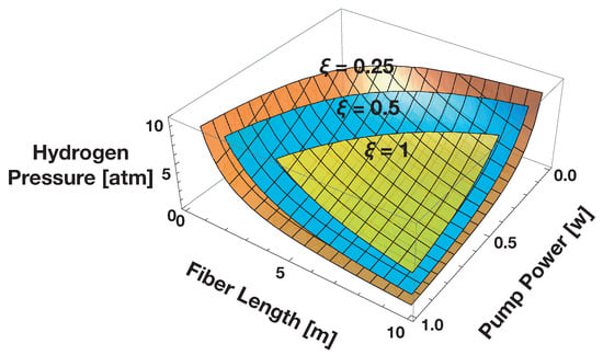 Contour curves for as a function of hydrogen pressure, the hollow-core photonic crystal fiber (HC-PCF) length, and the pump power.