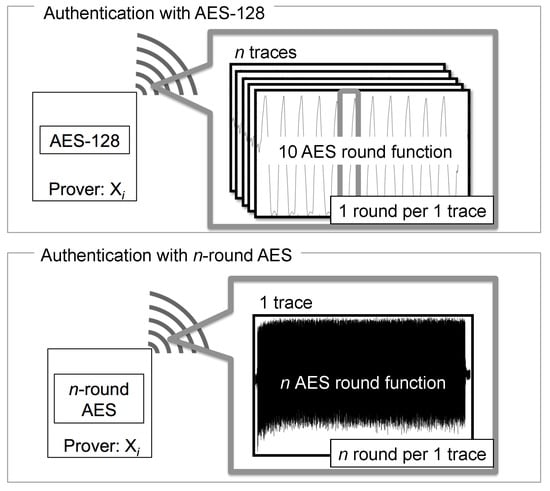 An easy alternative option is to use a modified AES that has more than 10 round operations, which is called a n-round AES. Here, n should be larger than 10 and big enough, e.g., , so that a single side-channel trace is enough to perform the authentication. A n-round AES could simplify the system and the modification of the AES hardware could be minimized as well. To prevent security threats from conventional side-channel key recovery attacks, several rounds, e.g., 4 rounds, near the public data are not used in the r-round AES authentication.