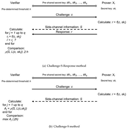 The possible protocols for side-channel authentication were discussed in [1]. In this paper, we only discuss the Challenge-S-Response authentication and the Challenge-S authentication, as shown in Figure 2a,b. Here, challenge c and response r are the same with conventional authentication schemes, and S denotes the side-channel information.