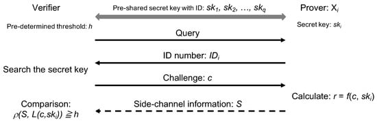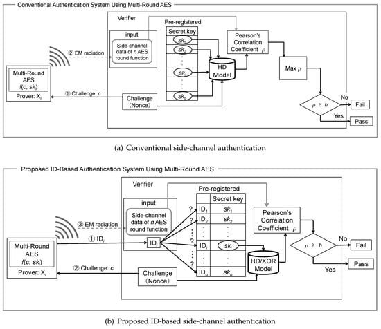 As shown in Figure 3, the pairs of ID and secret key of q provers, (ID, ), (ID, ), …, (ID, ) are registered in the verifier. The verifier initiates the authentication by sending an ID query to the prover, and then the verifier receives the prover’s ID as ID. The verifier searches for the corresponding secret key and creates the corresponding leakage profile for the n-round AES. Then, Pearson’s correlation coefficient is calculated between the measured estimated side-channel information. Finally, the verifier confirms whether the correlation coefficient is larger than the pre-determined threshold h to decide the authentication result. If the derived is larger than the pre-determined threshold h, the authentication is successful.