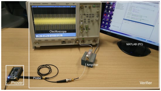 In the experiment, we used ALTERA CycloneIV (FPGA) on Terasic DE0-nano (FPGA board) [6] as the prover device. A 1000-round AES modified from the 128-bit AES [7] was used as the calculation to generate side-channel information. The AES implementation uses a 128-bit data path and the composite-field S-box, which runs at 50 MHz on the DE0-nano board. The side-channel information was measured as the electro-magnetic radiation near the FPGA by the EM probe (Langer-EMV RF-U 5-2). The signal captured by the probe was recorded using an oscilloscope (Agilent Technology DSO7032A), which recorded at 1 GSa/s. Each measurement included about 21,000 samples. A photo of the experimental setup is shown in Figure 5. Note that, the measurement of side-channel information can be performed without modifying the hardware, but the probe still needs to be close to the FPGA to ensure the quality of measurements is sufficient [8,9].