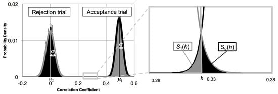 In our method, h is determined such that the probabilities of false acceptance and false rejection rates occurring are equal, i.e., the error rate was required to be equal. Thus, the equal error rate adopted in our authentication system assumes that false acceptance and false rejection occur with the same probability. Therefore, in the case of , the threshold h is expressed as