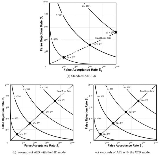 where and are constants that are experimentally determined with the correlation coefficients between the observed n-round side-channel information and the leakage model. Therefore, with the threshold, defined as h, the probability of a false rejection ratio and false acceptance ratio are represented by