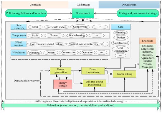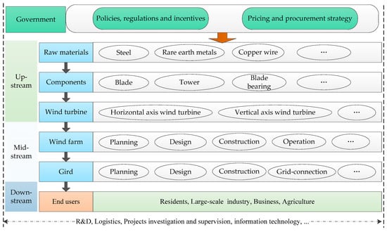 After decades of development, China has formed a complete industrial chain, including raw material supply, components manufacturing, wind turbines, wind farms, power grids, end users, and supporting parts, such as technology, talent, institutions, and markets [11,12], as Figure 1 shows. Despite the development scale, it’s noteworthy that the wind power industry in China is facing numerous challenges, including an extremely high wind curtailment situation [13,14,15], dependence on subsidy policy [16,17,18,19,20], imbalanced industry development [7,21], and an especially low overall value creation effect of the industrial chain. However, the global wind power industry is experiencing a key node of adjustment and reconstruction, and the development of renewable and sustainable energy technology makes it a more intensive, efficient, greener, and complicated value creation, transfer, delivery, and adding value chain system that aims to reduce non-value-adding operations as much as possible to realize a maximal conversion of value [22] and overall symbiosis effect instead of a simple pursuit of installed capacity performance, which arouses fundamental concern in view of the low value-adding efficiency of the current wind power industry from the perspective of value theory and overall competition. Motivated by the gap between the desirable value efficiency of expected wind power value chains, and the current situation compared to the potential value-adding capability, it becomes increasingly necessary to construct a wind power industry value chain model and launch a comprehensive analysis for it to increase overall value efficiency and provide corresponding value-adding suggestions. Another motivation of this paper is to enrich academic analyses about wind power industry value chains based on value theory, which is important but which has not been fully investigated in previous studies.