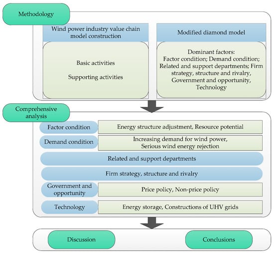 - For the comprehensive analysis with the diamond model: (i) a factor condition analysis showed that China was experiencing domestic energy structure adjustment and would increase the proportion of wind power in its energy consumption structure. (ii) China had increasing demand for wind power, and the consumption goal was guaranteed by the government; however, serious wind rejection brought about the need for value chain integration. (iii) Except for power generation and transmission subjects, increment power distribution subjects, ES subjects, and power selling subjects with promising value efficiency have undergone simultaneous rapid development. (iv) As for firm strategies, structures, and rivalries, more liberalized market modes were able to stimulate the value chain. (v) Government support laid robust foundation for value chain development. (vi) As a high value-adding sector, ES technology and the UHV grid had significant performance in China.
