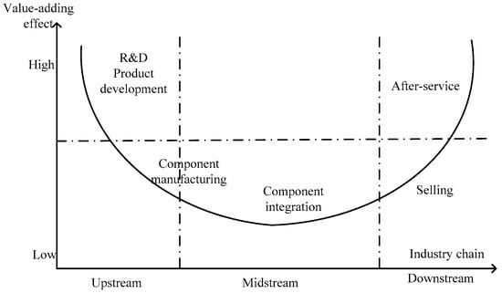 Most previous research has focused on the status quo, challenges, and development analyses of wind power from the perspective of global and national macroscopic policies and economics (as shown in Table 1). This paper describes and analyzes the internal structure and the value creation and innovation of the wind power industry value chain that clarifies the value transfer and value-adding process that occurs when converting raw materials to a final product or service [11]. According to the value theory of Michael Porter [47], value creation in a given industry is composed of a series of processes, including the basic activities and the supporting activities; the former is the key point of value creation of the wind power industry. Meanwhile, like technology-intensive industry, the value creation sectors can be described with the smiling curve (see Figure 3), which reveals the high value-adding sectors in the research and development stage and the after-service stage of the wind power industry that should be taken into account in the value chain model’s construction.