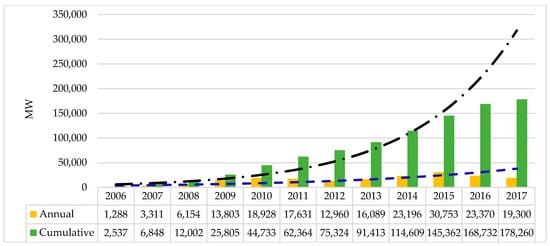 Annual and cumulative installed capacity of wind power in China [8,17,53].