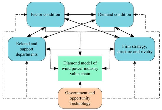 To fill this gap, this paper focuses on a value chain analysis of wind power industry; it begins by constructing a value chain model and introducing the diamond model for comprehensive analysis. This model is suitable for analyzing the mutual influences between elements and their influences on the wind power industry; it has been widely used in industrial comprehensive analyses. Zhao [28] used a diamond model to understand the status quo of the Chinese wind power industry. Zhao [42] identified and analyzed, with the diamond model, factors that had significant impacts on the development of China’s PV power industry. Wu [43] used the diamond model to analyze internal and external factors that had significant influences on the competitiveness of China’s coal industry. The role of Multinational Enterprise (Mne) penetration and governance quality was studied with the diamond model by Fainshmidt [44]. Nam explored the success factors of the ‘Night Markets’ in Korea using the diamond model [45]. Kai Fang et al. effectively assessed national renewable energy competitiveness of the G20 with a revised diamond model [46]. Based on the wide application of the diamond model in comprehensive analyses of certain industries, we apply and modify it in analyzing the wind power industry value chain in China. In contrast to traditional diamond models, we modify it by considering Government, Opportunity, and Technology as dominant factors instead of accessory elements. Moreover, measurements of improving value creation and the innovation and symbiosis effects of the wind power value chain will be discussed.