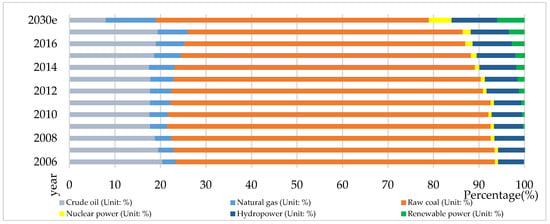 Energy structure during 2006–2017. Data source: BP Statistical Review of World Energy 2017 [58]; BP Statistical Review of World Energy 2018 [59]; Energy production and consumption reform strategy (2016–2030) [60]; Chinese industry information (2016) [61].