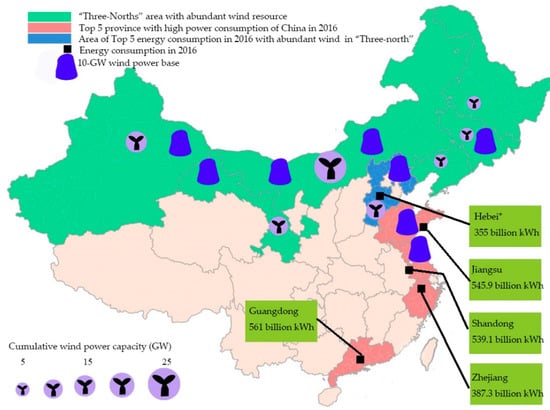 Wind resource and energy consumption distribution in China (Data source: location data of 10-GW wind power base is based on [24], data of cumulative installed capacity is integrated by [62] and Chinese Wind Power, data of energy consumption is collected from statistical data from the corresponding Provincial Bureau of Statistics. Magnitude of energy consumption of Hebei is predicted with data from January and August, 2016).