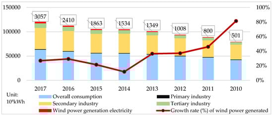 Energy consumption structure and wind power generation electricity of China during 2010–2017. (Data in the label refers to magnitude of wind power generation electricity and the data is collected and integrated with references [8,64,65] and NEA).