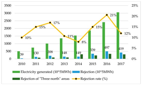 Wind power generation and rejection situation in China in 2010–2017. (Data source: the electricity generated data and rejection data of 2010 to 2012 was from [4,14]. From this, the corresponding rejection rate was calculated, and we modified partial data from the Electricity Regulatory Annual Report 2010 reported by China’s Central People’s Government [66]. Other electricity generated data and rejection data are collected from the annual wind power development report from the website of NEA. Data regarding the rejection rates of the “Three-north” areas are integrated from [10,62,67,68,69]).