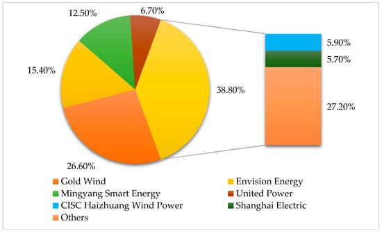 The value creation and innovation of the whole value chain depends on collaboration between various departments. From the prospect of wind turbines and components manufacturing, even though it lies in the low value-adding section of smiling curve, Chinese wind equipment manufacturing has made significant achievements, and has contributed to wind power globally to a large extend despite the fact that this industry in China is at its initial stage of development. The capacity of newly-installed wind power in China reached 1966 MW in 2017, of which 72.8% came from the top 6 manufacturing firms, as outlined in Figure 12. As for Chinese grid construction, uneven distribution between wind resource and cities with heavy loads gives rise to long-distance grid construction demand, but current grid construction in China is primarily designed for traditional power generation instead of renewable energy generation. Considering long-term wind energy consumption requirements, long-distance and ultra-high voltage (UHV) power transmission are discussed in various government reports. More details about UHV power transmission is provided in Section 3.6.2.