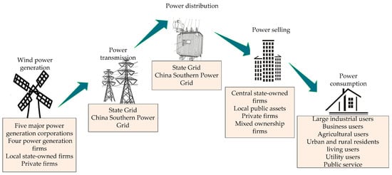 The wind power industry in China is dominated by three kinds of firms, namely: industrial leaders, traditional wind equipment manufactures, and wind power generation firms [75]. This paper describes the strategies, structures, and rivalries of wind power firms following the value chain route shown in Figure 14. In order to further deepen the efficiency of the power system, the State Council [76] pointed out that China would liberalize electricity prices in an orderly manner, excluding transmission and distribution systems, open the power selling business to social capital, and liberalize power generation plans, except for public welfare and regulatory ones. On this basis, more and more social capital is being invested in the power distribution and selling industries, thus enhancing the market’s competitiveness and effectiveness, and increasing overall value creation and the innovation effect.