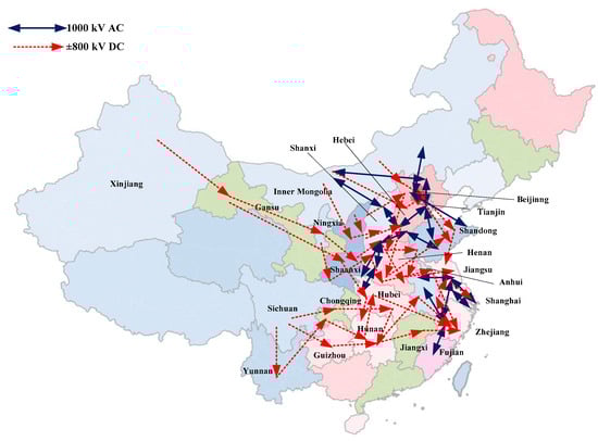The UHV grid system in China is being developed with amazing speed, and has attracted global attention. Indeed, 1100 kV extra-high voltage transmission lines are under construction to enhance the energy exchange and transmission ability of whole country. On 8 January 2018, ±800 kV DC power transmission technology won the Grand Prize of 2017 National Science and Technology Progress Award of China for its high voltage level, large transmission capacity, long transmission distance, and advanced technique level. Meanwhile, core technology equipment of the DC power grid, ±500 kV DC power transmission lines research and development, and new types of UHV AC power transmission technologies are encouraged at the national level. The State Grid of China has completed the “Eight ACs and Ten DCs” UHV power transmission projects crossing the “Three-Norths” areas and coastal cities by 2017, which improve wind power grid connections and the consumption abilities of the whole country. These transmission lines are shown in Figure 15 and Table 5.