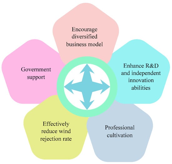 - Government support. Whether or not the government can make a difference in the policy incentives and the legal environment design of wind power development is a crucial question. At the top stage of the value creation and innovation of the wind power industry value chain, the government should provide suggestions on how to use market leverage and how to design, establish, and guide market-oriented institutions, mechanisms, policies and measures, laws and regulations, and supervision through “visible hands”. The wind power rejection phenomenon should be improved by related development plans and financial & economic incentives; additionally, ES technologies should be further promoted to help grid connection of wind power and reduce the corresponding influence on the grid, and power generation and selling firms and power market development and operation should be encouraged and supported, demand side response technologies and regulations for increasing wind power consumption should be promoted and determined. None of these can be accomplished without government support.