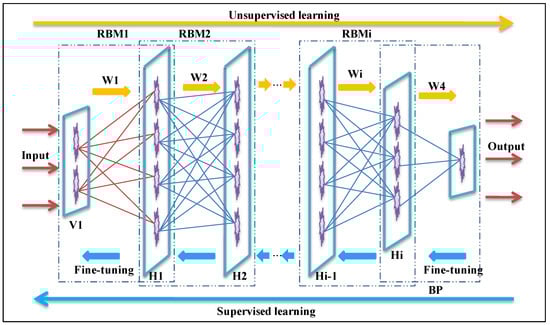 The deep belief network (DBN) is an in-depth network efficient learning algorithm proposed by Hinton et al.; it processes high-dimensional and large-scale data problems [32] such as image feature extraction and collaborative filtering. DBN essentially consists of multiple Restricted Boltzmann Machine (RBM) networks and a supervised Back Propagation (BP) Network. The lower layer represents the details of the original data. The higher layer represents the data attribute categories or the characteristics, from a low-level to high-level layer-by-layer abstraction; it has the characteristics of gradually tapping deep data features. The specific structure is shown in Figure 1.