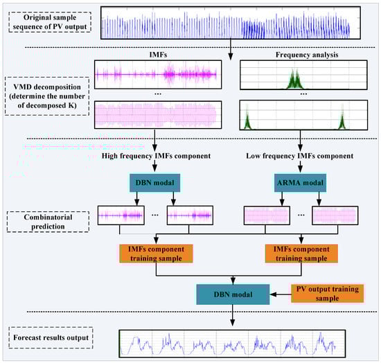 Considering the nonlinear, non-stationary, and periodic characteristics of PV output data, and considering that the time series ARMA is a linear model, the prediction effect on non-stationary data is not good; however, the better-trained neural network has higher accuracy for non-stationary data prediction. Therefore, in this work, PV prediction based on the VMD-ARMA-DBN model is used to decompose the PV output time series into multiple IMFs with different frequencies. The predictive models for different IMFs sequences are established (respectively) to reduce the interaction between varying characteristics. Finally, DBN is used to reconstruct the prediction components to obtain the predicted value of the original sequence. The specific process is shown in Figure 3.